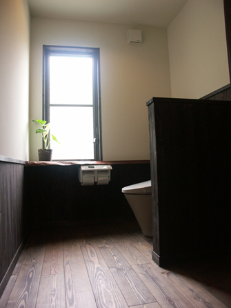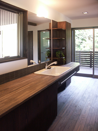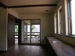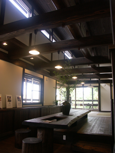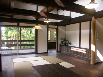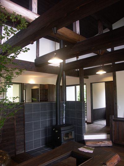 | 邸宅内は落ち着いたダークブラウンをベースにしたモダンなデザインに統一。 おしゃれな古民家風の赴きとスタイリッシュさを兼ね備えた空間に仕上がりました。 昔ながらの小屋組みに唐松の床板がマッチングしています。 ![]() |